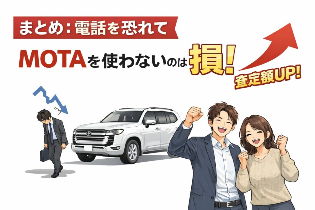 「電話が面倒で一括査定は無理」と決めつけず、上位3社に絞れるMOTA車買取を選ぶのが現実的です。